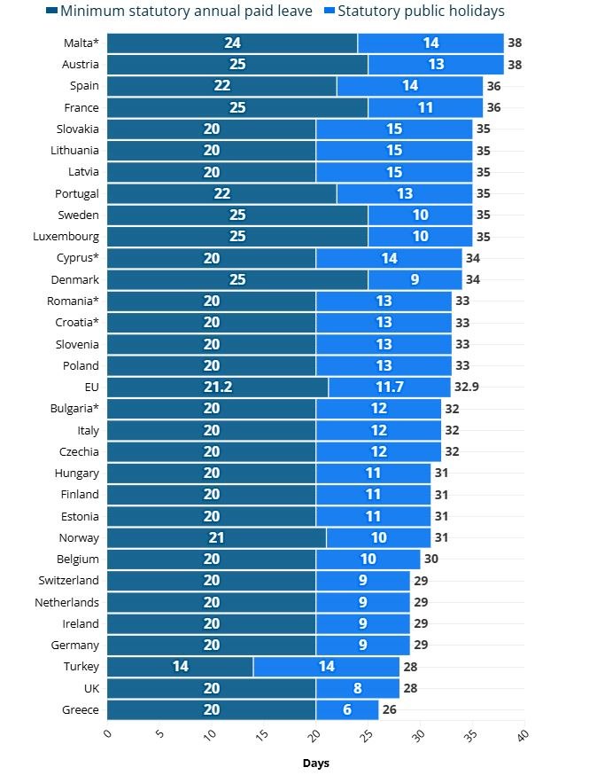 Συνδυάζοντας τις ελάχιστες αμειβόμενες άδειες και τις υποχρεωτικές αργίες στην ΕΕ, η Ελλάδα έχει τον μικρότερο αριθμό ημερών ξεκούρασης, με μόλις 26 ημέρες. Η Αυστρία και η Μάλτα προσφέρουν τον υψηλότερο με 38 ημέρες. Ο μέσος όρος στην ΕΕ είναι 33 ημέρες.