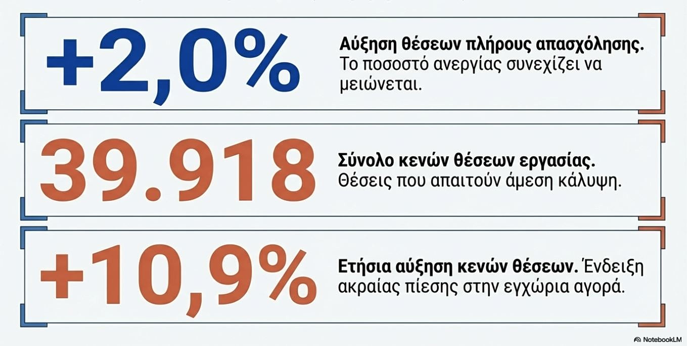 Ο αριθμός των κενών θέσεων, σύμφωνα με τα εποχικά διορθωμένα στοιχεία της Eurostat, ανήλθε στις 39.918 θέσεις εργασίας, αυξημένος κατά 10,9% σε σύγκριση με το αντίστοιχο τρίμηνο του 2024.