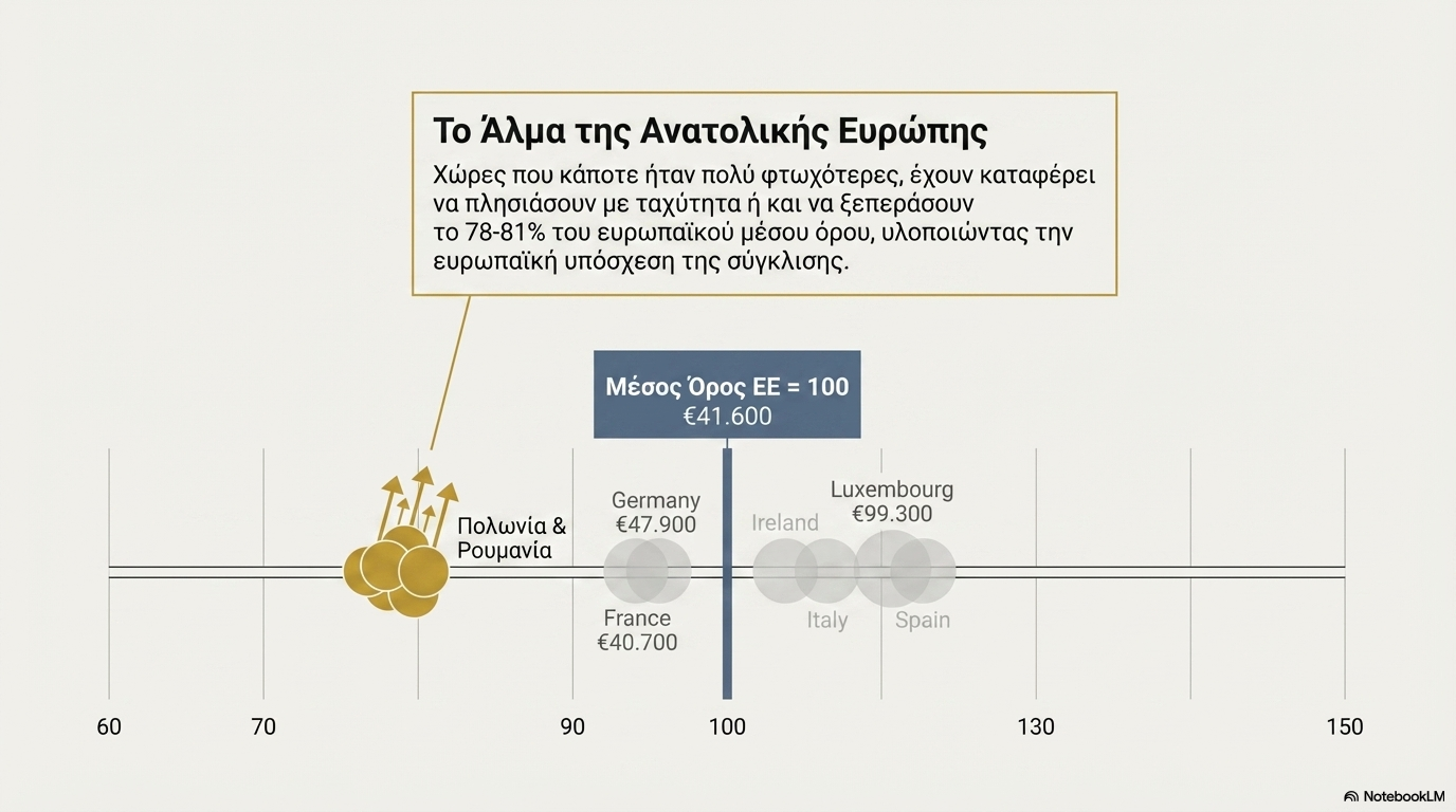 Το ανησυχητικό είναι ενώ χώρες της Ανατολικής Ευρώπης (όπως η Ρουμανία ή η Πολωνία), που κάποτε ήταν πολύ φτωχότερες, έχουν καταφέρει να πλησιάσουν ή και να ξεπεράσουν το 78-81% του μέσου όρου, η Ελλάδα παρουσιάζει μια στασιμότητα ή πολύ αργή άνοδο.