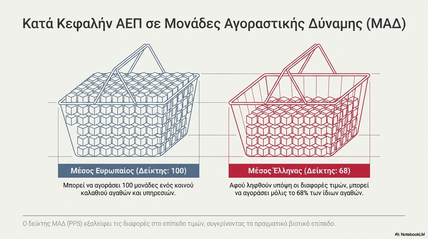 Το Κατά Κεφαλήν Ακαθάριστο Εγχώριο Προϊόν (ΑΕΠ) σε Μονάδες Αγοραστικής Δύναμης (ΜΑΔ) είναι ένας από τους πιο σημαντικούς δείκτες για να συγκρίνουμε το πραγματικό βιοτικό επίπεδο μεταξύ διαφορετικών χωρών. Το 2025, το κατά κεφαλήν ΑΕΠ σε ΜΑΔ διαφοροποιείται σημαντικά σε όλη την Ευρώπη. Με τον μέσο όρο της ΕΕ να ορίζεται στο 100, η Ελλάδα, το 2025, μαζί με τη Βουλγαρία, φιγουράρουν στις τελευταίες θέσεις της ευρωπαϊκής κατάταξης με 68.