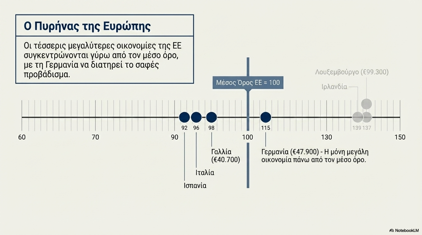 Μεταξύ των «τεσσάρων μεγάλων» οικονομιών της ΕΕ, η Γερμανία έχει το υψηλότερο κατά κεφαλήν ΑΕΠ σε ΜΑΔ, στο 115% του μέσου όρου της ΕΕ. Είναι η μόνη χώρα πάνω από το επίπεδο του 100%. Η Γαλλία βρίσκεται κοντά στον μέσο όρο της ΕΕ, στο 98%, ακολουθεί η Ιταλία με 96%, ενώ η Ισπανία καταγράφει το χαμηλότερο επίπεδο, στο 92% του μέσου όρου της ΕΕ.