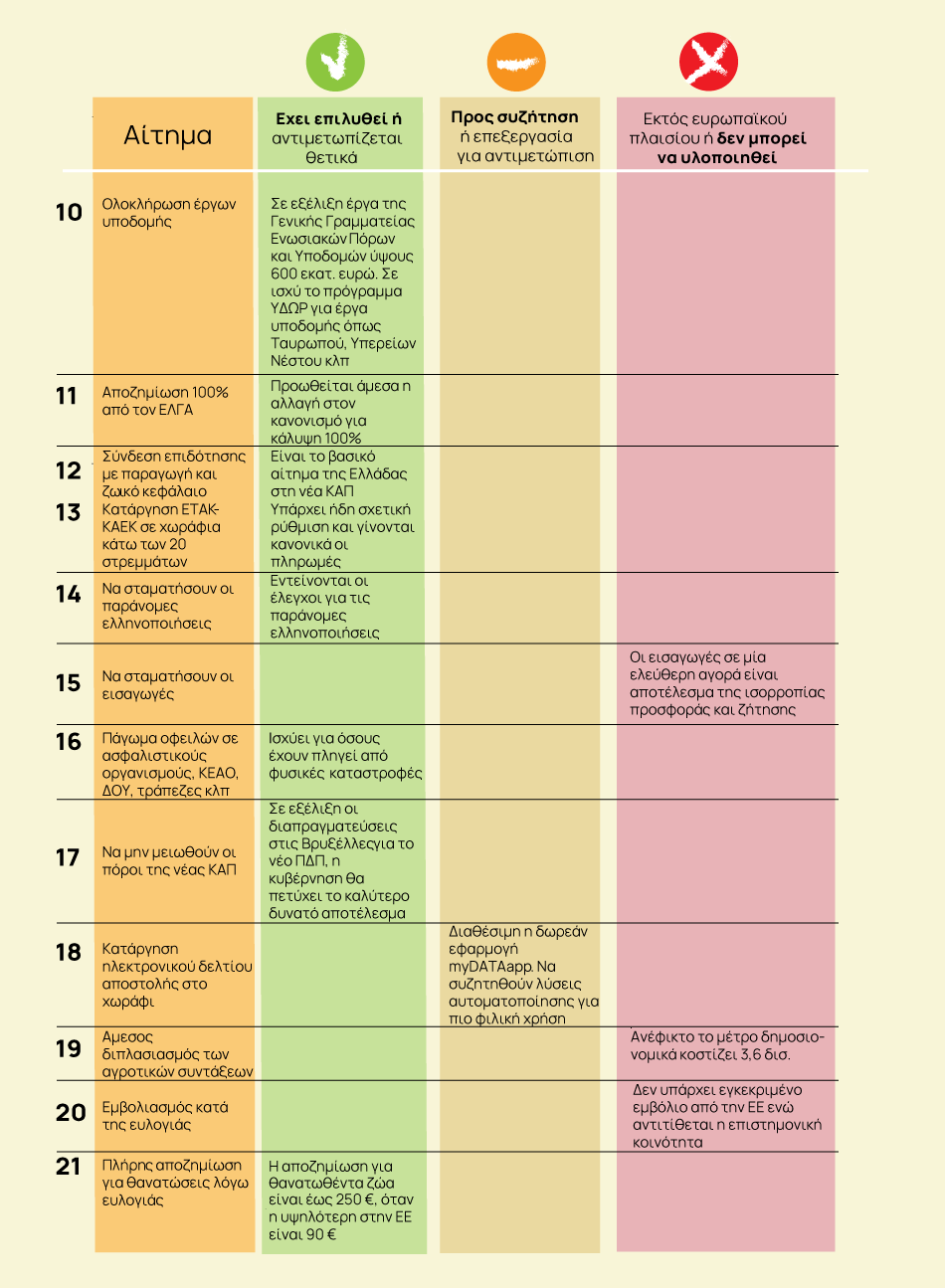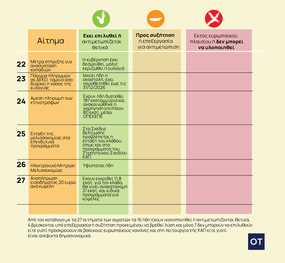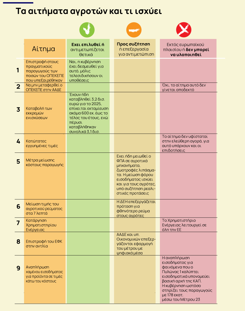 Όπως αναφέρεται σε ενημερωτικό σημείο από τον κατάλογο με τα 27 αιτήματα των αγροτών τα 16 ήδη έχουν ικανοποιηθεί ή αντιμετωπίζονται θετικά, 4 βρίσκονται υπό επεξεργασία ή συζήτηση προκειμένου να βρεθεί λύση και μόνο 7 δεν μπορούν να επιλυθούν είτε γιατί προσκρούουν σε βασικούς ευρωπαϊκούς κανόνες και στη λειτουργία της ΚΑΠ είτε γιατί είναι ανέφικτα δημοσιονομικά.