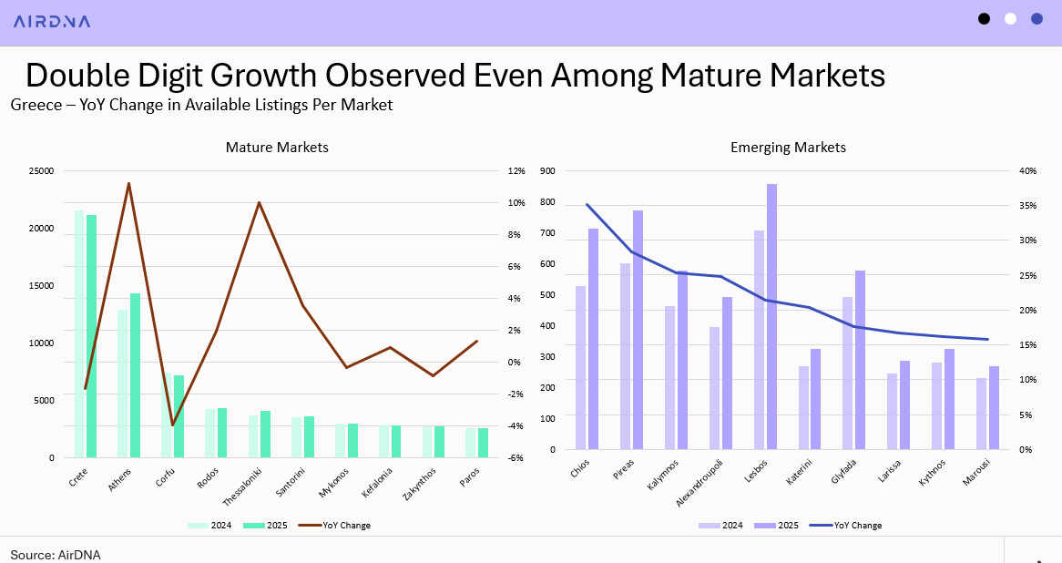 Από το 2023 και μετά, ενώ οι ανταγωνιστές της Μεσογείου επιβράδυναν, η Ελλάδα παρουσίασε επιτάχυνση, φτάνοντας να έχει πάνω από 130.000 ενεργές καταχωρίσεις, με την προσφορά να φτάνει στο ρεκόρ των περίπου 160.000 καταχωρίσεων το 2025, πριν την παραδοσιακή μείωση του τέταρτου τριμήνου.