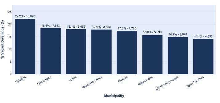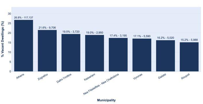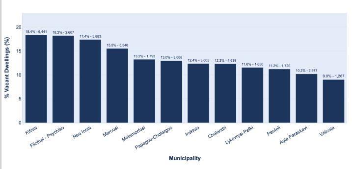 Σχεδόν 120.000 είναι οι κενές κατοικίες στην Αθήνα, περίπου όσο ο συνολικός αριθμός όλων των κατοικιών στην Πάτρα, που αποτελεί τον τέταρτο μεγαλύτερο δήμο της Ελλάδας, ενώ πολύ υψηλά ποσοστά παρατηρούνται επίσης και σε άλλες περιοχές της Αττικής, ειδικά στον Πειραιά, αλλά και στους νότιους και δυτικούς δήμους του λεκανοπεδίου, όπου υπάρχει και μεγαλύτερη συγκέντρωση κατοικιών.