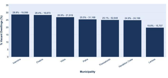 Οι περισσότερες μεγάλες κοινότητες εκτός Αττικής παρουσιάζουν πολύ υψηλά επίπεδα κενών κατοικιών που κυμαίνονται από 24% έως 29%.