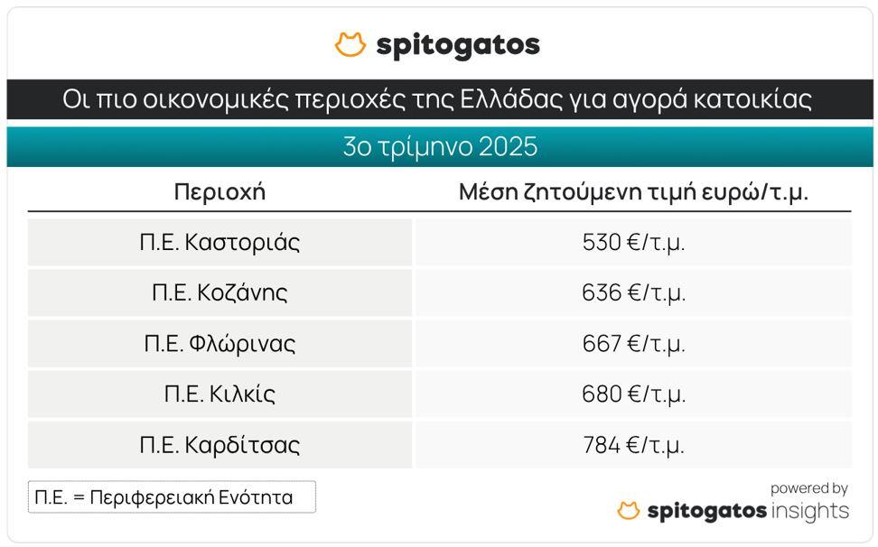 Εξετάζοντας τα πιο οικονομικά σημεία της χώρας, οι Π.Ε. Καστοριάς, Κοζάνης, Φλώρινας, Κιλκίς και Καρδίτσας αποτελούν τις 5 πιο οικονομικές επιλογές για αγορά κατοικίας κατά το 3ο τρίμηνο του 2025.