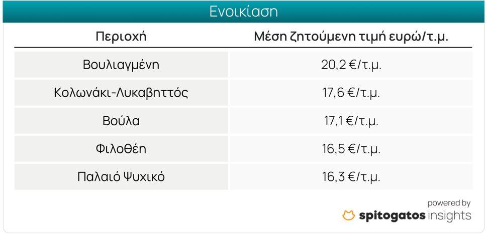 Οι top 5 πιο ακριβές περιοχές για ενοικίαση κατοικίας στην Αττική είναι η Βουλιαγμένη και η Βούλα στα Νότια Προάστια, η περιοχή Κολωνάκι-Λυκαβηττός στο κέντρο της Αθήνας, η Φιλοθέη και το Παλαιό Ψυχικό με ΜΖΤ στα 16,3 ευρώ/τ.μ.