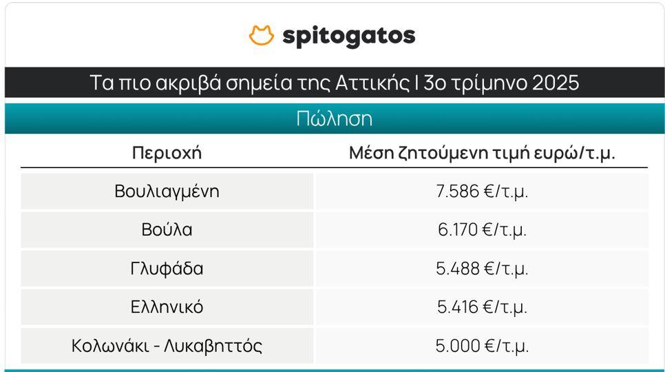 Στην κορυφή των πιο ακριβών περιοχών της Αττικής για αγορά κατοικίας βρίσκεται και το 3ο τρίμηνο του 2025 η Βουλιαγμένη με ΜΖΤ 7.586 ευρώ/τ.μ., ενώ ακολουθούν άλλες περιοχές των Νοτίων Προαστίων όπως η Βούλα, η Γλυφάδα, το Ελληνικό, αλλά και του κέντρου της Αθήνας όπως η περιοχή Κολωνάκι-Λυκαβηττός με ΜΖΤ πώλησης κατοικίας στα 5.000 ευρώ/τ.μ.