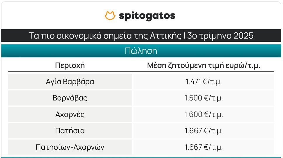 Ως οι πιο οικονομικές περιοχές της Αττικής για αγορά κατοικίας κατά το 3ο τρίμηνο του 2025 αναδεικνύονται οι εξής περιοχές: η Αγία Βαρβάρα με ΜΖΤ στα 1.471 ευρώ/τ.μ., η περιοχή του Βαρνάβα με ΜΖΤ πώλησης κατοικίας στα 1.500 ευρώ/τ.μ., οι Αχαρνές με ΜΖΤ στα 1.600 ευρώ/τ.μ., η περιοχή Πατησίων-Αχαρνών και τα Πατήσια.
