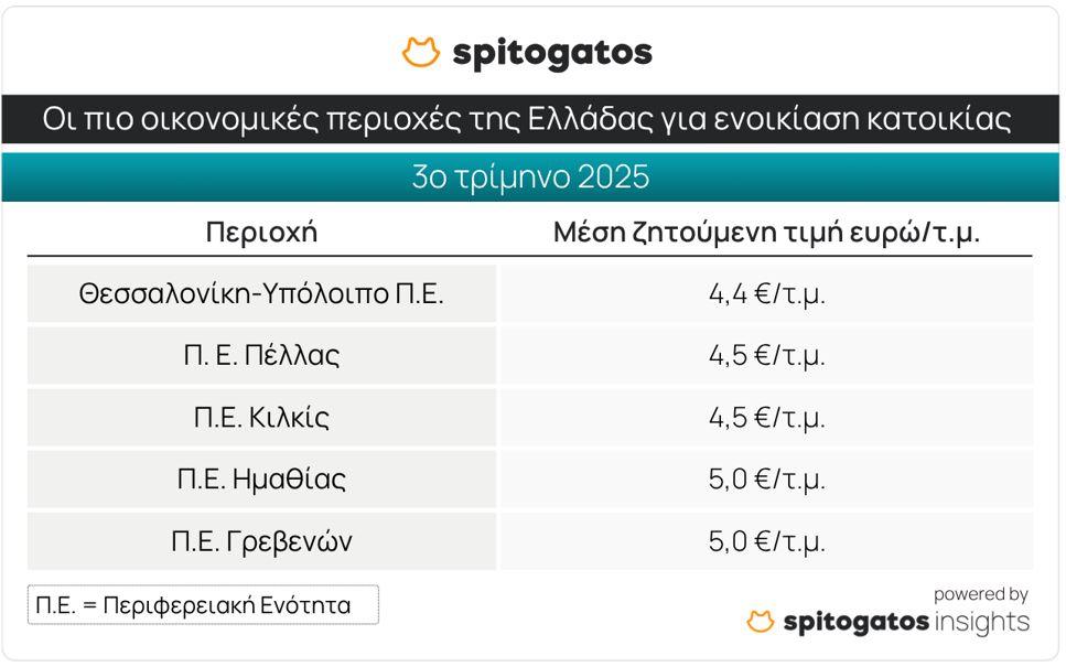 Σε ό,τι αφορά την ενοικίαση κατοικίας, στο top 5 με τις πιο οικονομικές περιοχές της χώρας κατά το 3ο τρίμηνο του 2025 συγκαταλέγονται το υπόλοιπο Π.Ε. Θεσσαλονίκης, οι Π.Ε. Πέλλας, Κιλκίς, Ημαθίας και Γρεβενών.