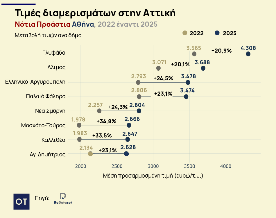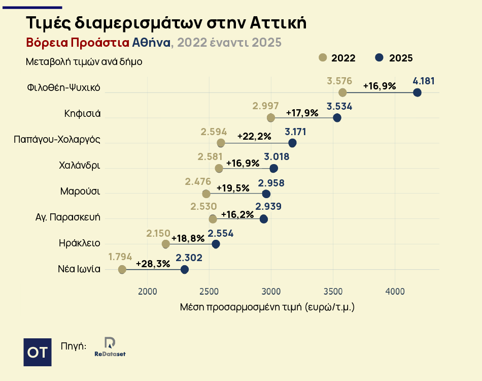 Σύμφωνα με έρευνα της ReDataset, η άνοδος των τιμών στην Αττική δεν περιορίζεται πλέον στις παραδοσιακά «ακριβές» περιοχές, αλλά διαχέεται σε ολόκληρο το λεκανοπέδιο.