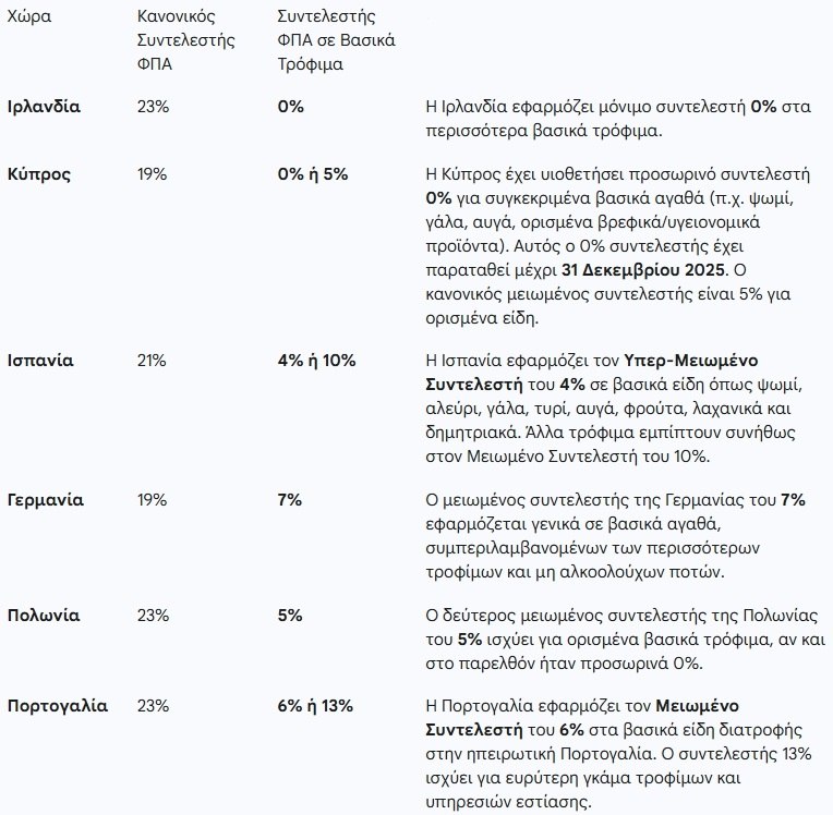 Ευρωπαϊκή πρακτική: Παράδειγμα αποτελούν χώρες όπως η Ιρλανδία και η Κύπρος, που εφαρμόζουν μηδενικό ΦΠΑ (0%) σε μεγάλο εύρος βασικών τροφίμων (η Κύπρος το παρέτεινε μέχρι τέλος του 2025).