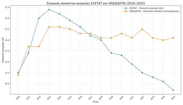 Μέχρι το 2017 οι δύο φορείς μέτρησης της ανεργίας κινούνταν περίπου παράλληλα, με αποκλίσεις λίγων ποσοστιαίων μονάδων. Από το 2021 και μετά, όμως, το χάσμα διευρύνεται ραγδαία. Αν οι εγγεγραμμένοι άνεργοι της ΔΥΠΑ υπολογιστούν ως ποσοστό επί του εργατικού δυναμικού που χρησιμοποιεί η ΕΛΣΤΑΤ, το πραγματικό ποσοστό ανεργίας αγγίζει το 20–23%. Δηλαδή περισσότερο από το διπλάσιο του «επίσημου» δείκτη.