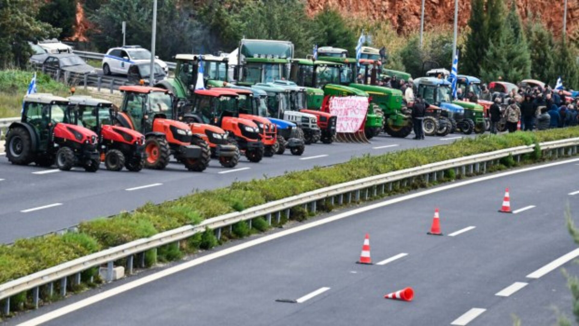 Οι αγρότες της Καρδίτσας έχουν παρατεταγμένα τα τρακτέρ στην άκρη του αυτοκινητόδρομου Ε65, αφήνοντας μιάμιση λωρίδα ελεύθερη και στα δύο ρεύματα κυκλοφορίας.