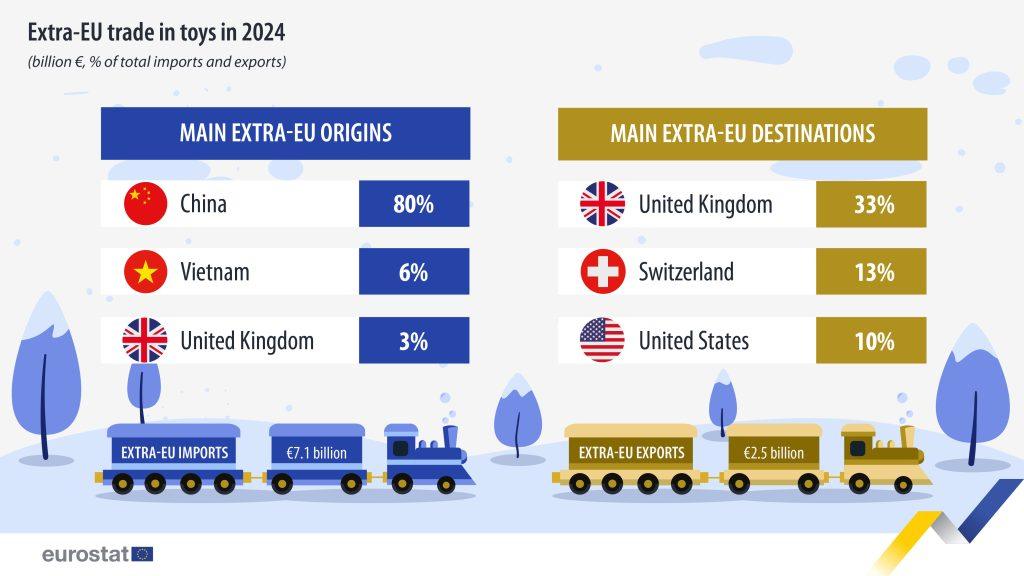 Η Κίνα ήταν ο μεγαλύτερος προμηθευτής παιχνιδιών στην ΕΕ με 80% (αξίας 5,6 δισ. ευρώ) των εισαγωγών παιχνιδιών, πολύ μπροστά από το Βιετνάμ που είχε μερίδιο 6% (418 εκατ. ευρώ) και τη Βρετανία (3%, 188 εκατ. ευρώ).