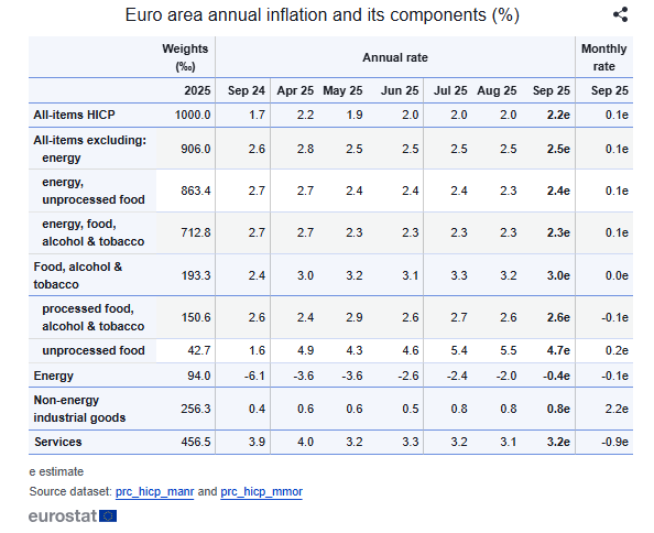 Τα στοιχεία της Γαλλίας έδειξαν πληθωρισμό στις υπηρεσίες στο 2,4% τον Σεπτέμβριο από 2,1% τον Αύγουστο, καθώς οι αυξήσεις στις τιμές της υγειονομικής περίθαλψης επιταχύνθηκαν και το κόστος των τηλεπικοινωνιών υποχώρησε λιγότερο σε σχέση με τους προηγούμενους μήνες. Οι τιμές της ενέργειας επίσης μειώθηκαν λιγότερο λόγω των συγκριτικών επιδράσεων, καθώς τον Σεπτέμβριο του 2024 είχαν καταγραφεί έντονες πτώσεις στα πετρελαϊκά προϊόντα.