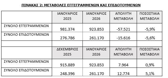 Ο αριθμός των επιδοτούμενων για τον μήνα Ιανουάριο 2026 ανήλθε σε 261.170 άτομα, όπως αναφέρει η ανακοίνωση της ΔΥΠΑ, καταγράφοντας μείωση κατά -15.616 άτομα (-5,6%) σε σχέση με τον αντίστοιχο μήνα του προηγούμενου έτους Ιανουάριο 2025 και αύξηση κατά 12.774 άτομα (5,1%) σε σχέση με τον προηγούμενο μήνα Δεκέμβριο 2025.