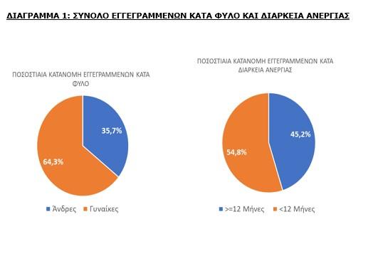 Από το σύνολο των εγγεγραμμένων τα 417.293 (ποσοστό 45,2%) άτομα είναι εγγεγραμμένα στο μητρώο της ΔΥΠΑ για χρονικό διάστημα ίσο ή και περισσότερο των 12 μηνών και 506.560 (ποσοστό 54,8%) είναι εγγεγραμμένα στο μητρώο της ΔΥΠΑ για χρονικό διάστημα μικρότερο των 12 μηνών.
