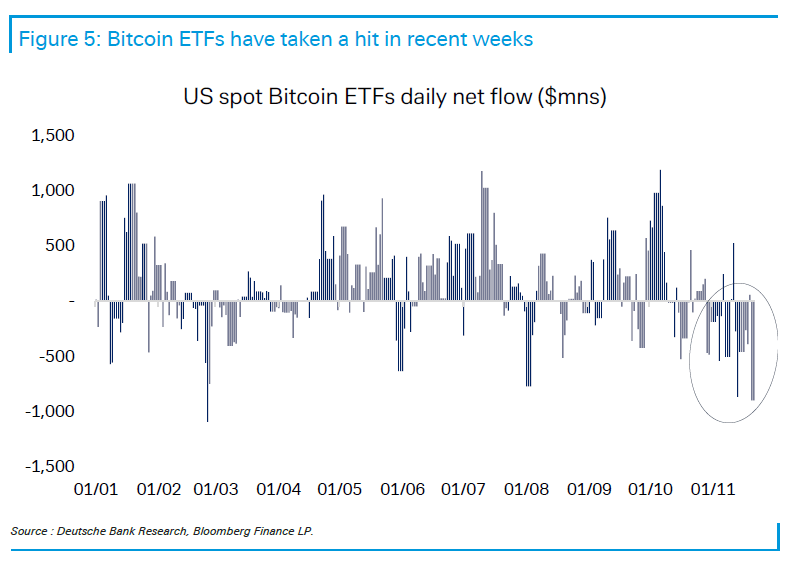Κατά την Deutsche Bank, η μεγάλη πτώση οφείλεται στο ευρύτερο κλίμα αποφυγής ρίσκου, στη σκληρή στάση της Fed για τα επιτόκια, στις καθυστερήσεις στη ρυθμιστική πλαισίωση, στις εκροές από θεσμικούς επενδυτές και στη ρευστοποίηση κερδών από μακροχρόνιους κατόχους.