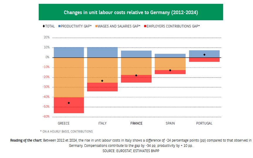 Η BN Paribas αξιολογεί τις διαφορές στην ανταγωνιστικότητα των τιμών σε σχέση με το γερμανικό πρότυπο και παρακολουθούνται μέσω του κόστους εργασίας ανά μονάδα, δηλαδή της αναλογίας μεταξύ των ωριαίων μισθών και των εξόδων (κυρίως των κοινωνικών ασφαλίσεων του εργοδότη) και της ωριαίας παραγωγικότητας.