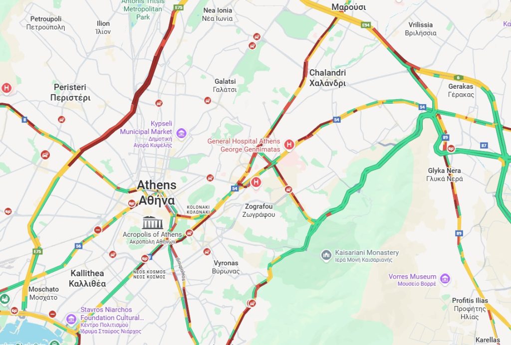 Την ίδια ώρα, στο «κόκκινο» βρίσκεται και ο Κηφισός και στα δύο ρεύματα, με τα μεγαλύτερα προβλήματα να εντοπίζονται στην άνοδο, από το Αιγάλεω έως το Μενίδι.