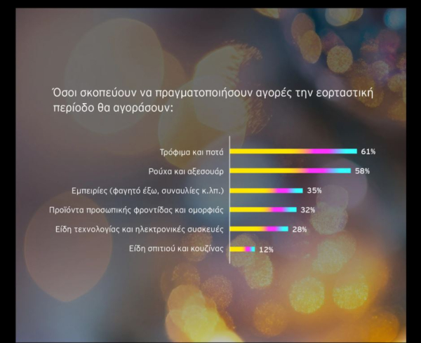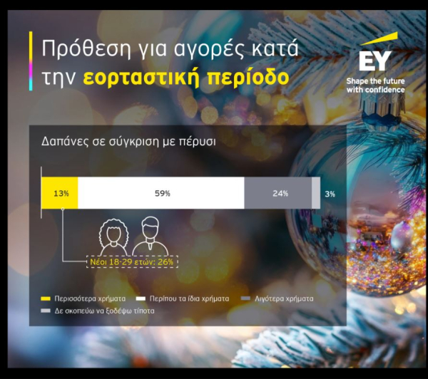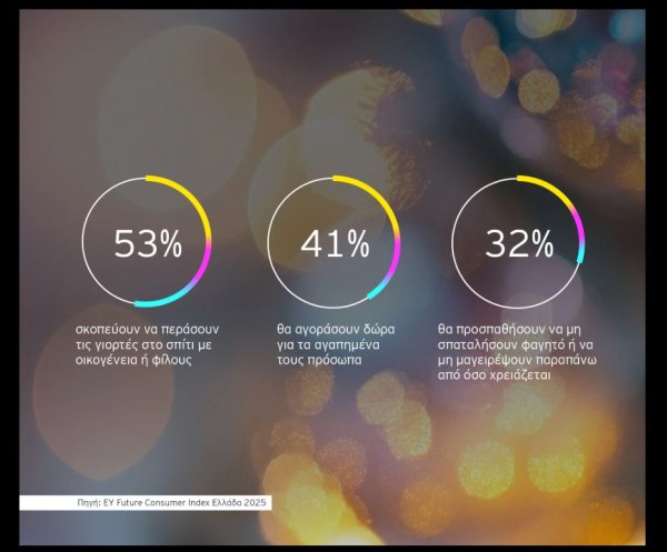 Η καταναλωτική έρευνα της ΕΥ για το πώς θα περάσουν οι Έλληνες τα Χριστούγεννα, μας αποκαλύπτει ότι το 41% θα κάνει δώρα στα αγαπημένα του πρόσωπα, το 53% θα περάσει τις γιορτές στο σπίτι και το 90% θα ψωνίσει με βάση την τιμή. Αντίστοιχη έρευνα της Klarna έδειξε ότι το 95%  έχει επηρεαστεί από την ακρίβεια, και στις χριστουγεννιάτικες αγορές.