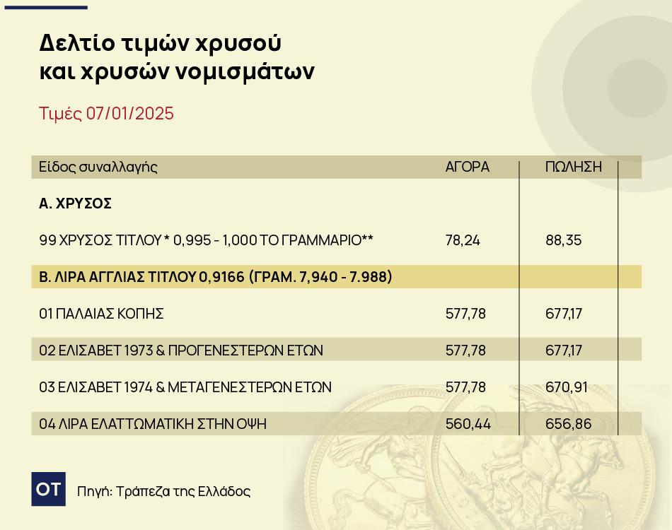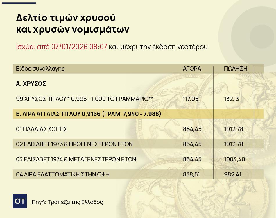 Με βάση το δελτίο τιμών, η ΤτΕ αγοράζει την χρυσή λίρα (Αγγλίας, παλαιάς κοπής) στα 864,45 ευρώ και την πουλάει στα 1012,78 ευρώ.