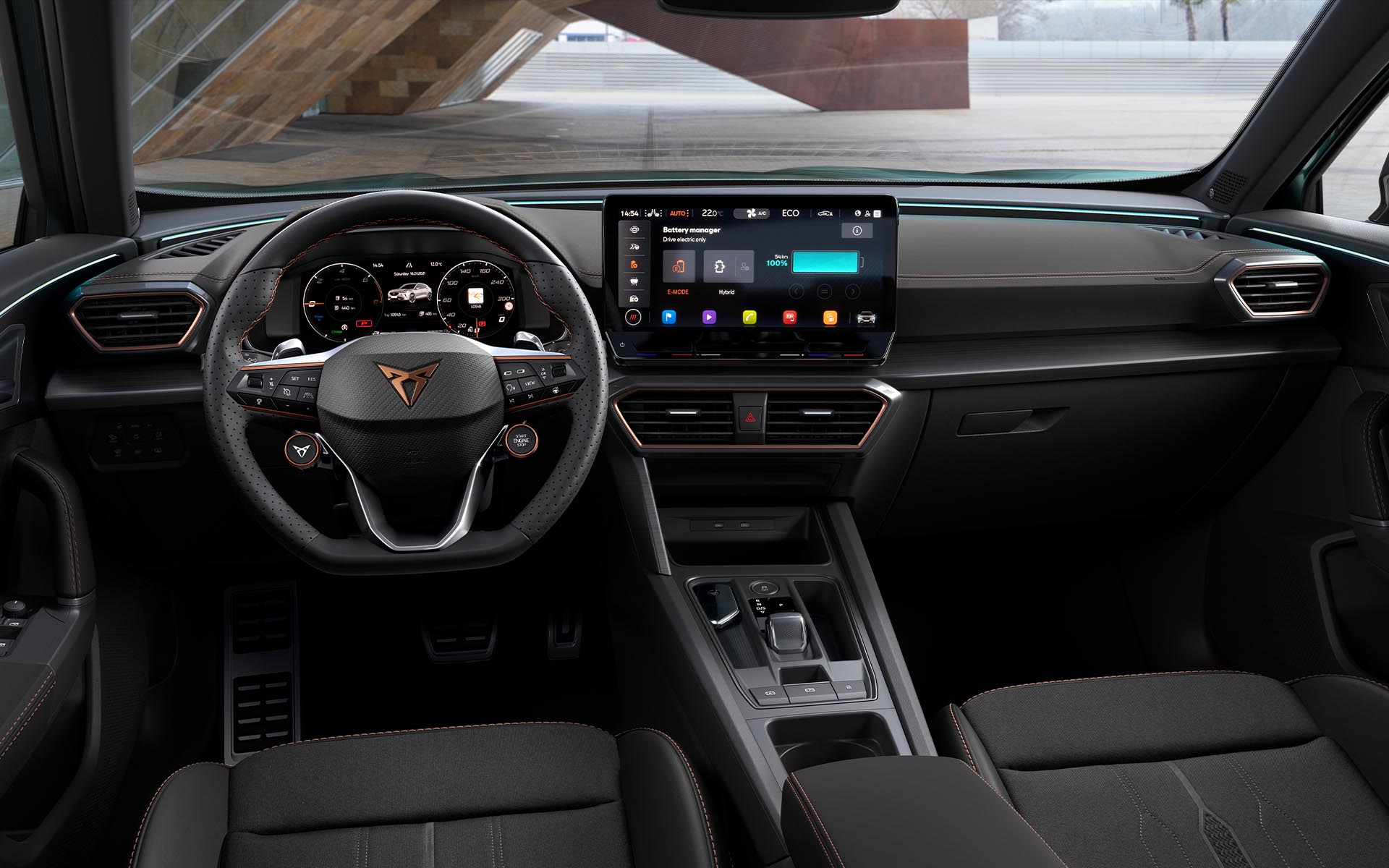 CUPRA, ενώ τα δύο ξεχωριστά κουμπιά στο τιμόνι για τα drive mode