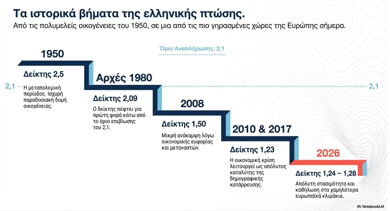 Η οικονομική κρίση λειτούργησε ως καταλύτης. Ο δείκτης υποχώρησε ξανά, φτάνοντας στο 1,23 το 2017. Σήμερα, το 2026, ο δείκτης παραμένει καθηλωμένος σε επίπεδα μεταξύ 1,24 και 1,28, καθιστώντας την Ελλάδα μία από τις πιο γηρασμένες χώρες της Ευρώπης.