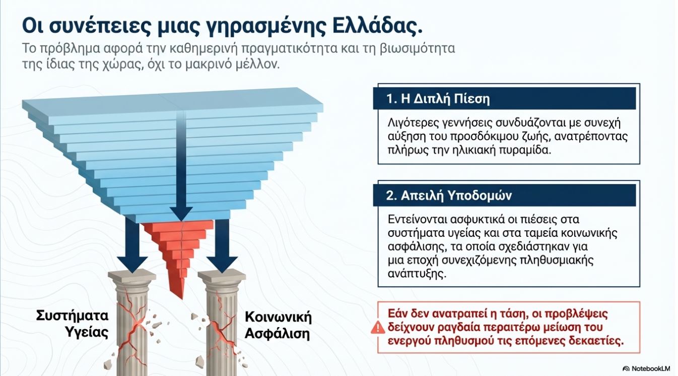 Για την Ελλάδα, το πρόβλημα είναι ακόμη πιο έντονο. Η χώρα συγκαταλέγεται στα κράτη με χαμηλή γονιμότητα εδώ και χρόνια, ενώ οι προβλέψεις δείχνουν περαιτέρω μείωση του πληθυσμού τις επόμενες δεκαετίες, εάν δεν ανατραπεί η τάση.