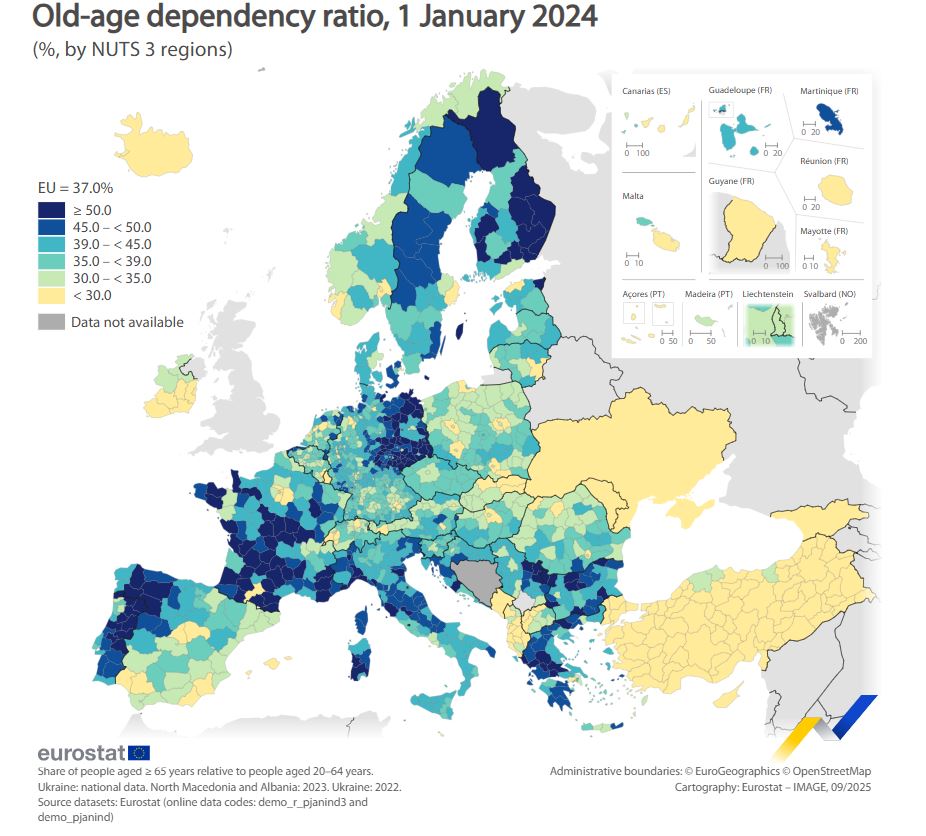 Συνολικά, τον Ιανουάριο του 2024, εντοπίστηκαν 139 περιφέρειες (NUTS 3) όπου ο δείκτης εξάρτησης ηλικιωμένων ξεπερνούσε το 50%. Οι περισσότερες από αυτές βρίσκονται στη Γερμανία (ανατολική) και τη Γαλλία, αν και σημαντικά ποσοστά εμφανίζονται επίσης στην Ιταλία, τη Φινλανδία, την Πορτογαλία, τη Βουλγαρία, την Ελλάδα και την Ισπανία.