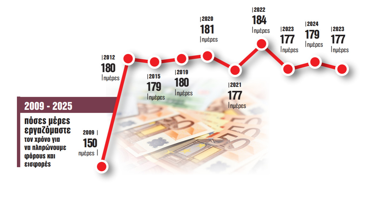 Από τις 365 ημέρες του έτους, οι Ελληνες, το 2025, εργάστηκαν τις 177 αποκλειστικά για το κράτος. Για να πληρωθούν, δηλαδή, οι φόροι και οι εισφορές της χρονιάς.