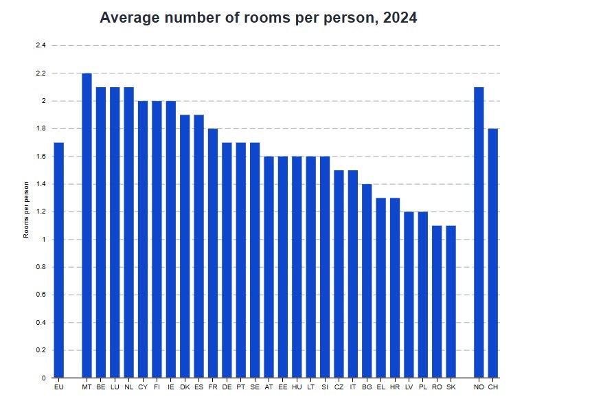 Το μέγεθος της κατοικίας μπορεί να μετρηθεί ως ο μέσος αριθμός δωματίων ανά άτομο: Το 2024 στην ΕΕ αντιστοιχούσαν κατά μέσο όρο 1,7 δωμάτια/άτομο. Μεταξύ των κρατών-μελών της ΕΕ, ο μεγαλύτερος αριθμός καταγράφηκε στη Μάλτα (2,2) και ακολουθούν το Βέλγιο, το Λουξεμβούργο και η Ολλανδία (2,1).