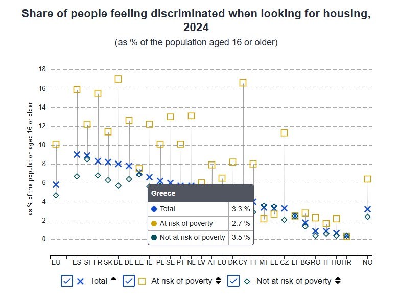 Προβληματισμό προκαλούν και τα στοιχεία για το ποσοστό των Ευρωπαίων που δηλώνουν ότι υφίστανται διακρίσεις όταν αναζητούν κατοικία. Το 2024, σχεδόν 6% όσων αναζητούσαν σπίτι τα τελευταία πέντε χρόνια ανέφεραν ότι ένιωσαν τουλάχιστον μία φορά να αντιμετωπίζονται με αυτόν τον τρόπο.