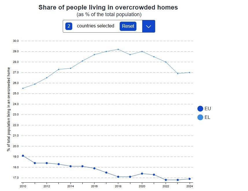 Περίπου το 17% του πληθυσμού της ΕΕ ζει σε σπίτι με περισσότερα άτομα από αυτά που αντιστοιχούν στη χωρητικότητά του. Το 2024, το 17% του ευρωπαϊκού πληθυσμού ζούσε σε τέτοια κατοικία, μειωμένο από 19% που είχε καταγραφεί το 2010.