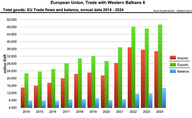 Από αυτά, οι εξαγωγές της ΕΕ προς την περιοχή ανήλθαν σε 49,06 δισ. ευρώ, ενώ οι εισαγωγές από τις χώρες των Δυτικών Βαλκανίων διαμορφώθηκαν σε 34,52 δισ. ευρώ — αφήνοντας πλεόνασμα υπέρ της ΕΕ ύψους 14,54 δισ. ευρώ.