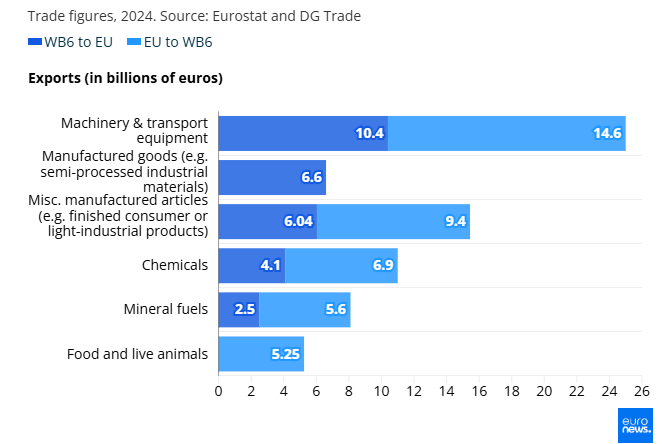 Η κυριαρχία της ευρωπαϊκής αγοράς είναι ξεκάθαρη: η ΕΕ αντιπροσωπεύει το 62% του συνολικού εμπορίου των Δυτικών Βαλκανίων, ενώ η ίδια η περιοχή συμμετέχει μόλις με 1,7% στο εξωτερικό εμπόριο της ΕΕ. Σε χώρες όπως η Σερβία, η Βοσνία-Ερζεγοβίνη και η Αλβανία, έως και τα τρία τέταρτα των εξαγωγών κατευθύνονται προς κράτη-μέλη της ΕΕ.