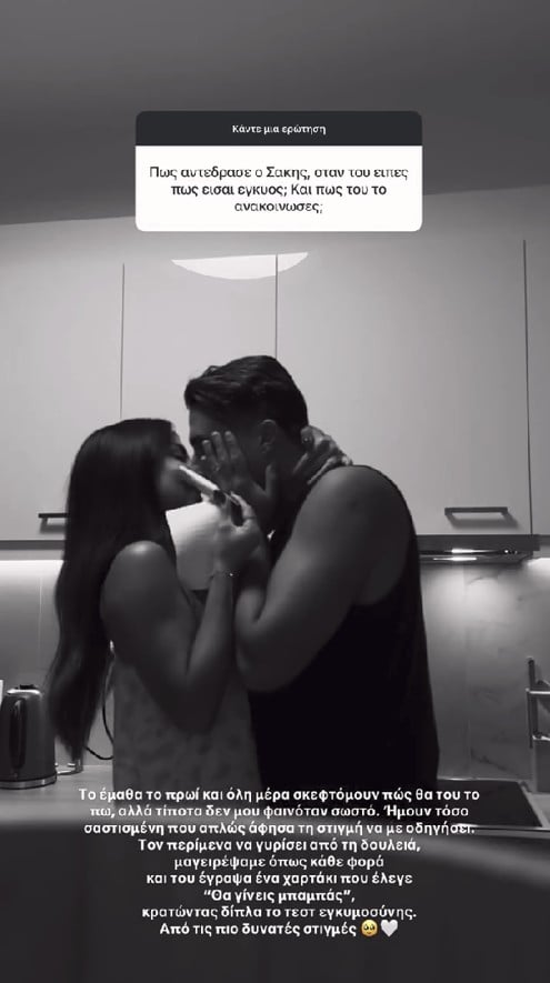 «Το έμαθα το πρωί κι όλη μέρα σκεφτόμουν πώς θα του το πω αλλά τίποτα δε μου φαινόταν σωστό. Ήμουν τόσο σαστισμένη που απλώς άφησα τη στιγμή να με οδηγήσει. Τον περίμενα να γυρίσει από τη δουλειά, μαγειρέψαμε όπως κάθε φορά και του έγραψα ένα χαρτάκι που έλεγε “θα γίνεις μπαμπάς” κρατώντας δίπλα το τεστ εγκυμοσύνης. Από τις πιο δυνατές στιγμές», έγραψε χαρακτηριστικά στην ανάρτησή της.