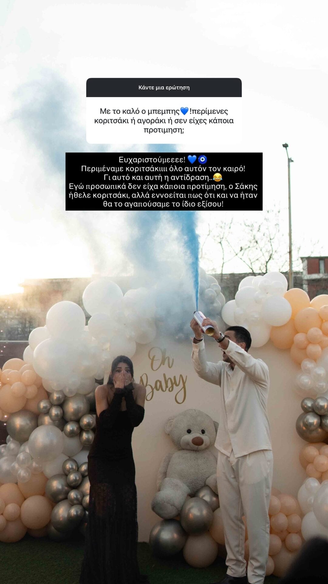 Το ερωτευμένο ζευγάρι ανακοίνωσε πρόσφατα στους διαδικτυακούς του φίλους το φύλο του μωρού, πραγματοποιώντας ένα gender reveal. Η Μαριαλένα Ρουμελιώτη και ο Σάκης Κατσούλης περιμένουν αγοράκι, με την έκπληξη να είναι ζωγραφισμένη στα πρόσωπά τους.