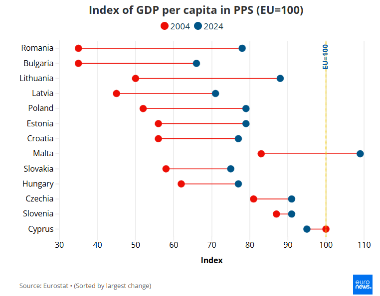 Το κατά κεφαλήν ΑΕΠ στην Τσεχική Δημοκρατία αυξήθηκε από 45% του μέσου όρου της ΕΕ το 2004 σε 74% το 2024, σημειώνοντας άνοδο από 9.490 ευρώ σε 29.940 ευρώ. Στη Λιθουανία, αυξήθηκε από 26% σε 68% κατά την ίδια περίοδο, από 4.960 ευρώ σε 27.350 ευρώ.