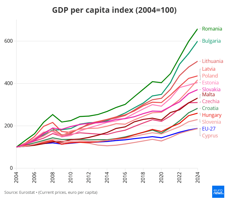 Τα τελευταία 20 χρόνια, από το 2004 έως το 2024, ενώ το κατά κεφαλήν ΑΕΠ στην ΕΕ αυξήθηκε κατά 88%, με τον δείκτη να ανεβαίνει από 100 σε 188 μονάδες, η ανάπτυξη στα 13 νέα κράτη μέλη σημείωσε θετική έκρηξη. Η Ρουμανία και η Βουλγαρία κατέγραψαν την ισχυρότερη ανάπτυξη, 558% και 500% αντίστοιχα, και ο δείκτης έφτασε τις 600 μονάδες και στις δύο χώρες.