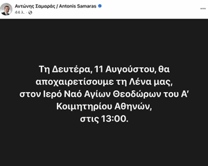 «Τη Δευτέρα, 11 Αυγούστου, θα αποχαιρετίσουμε τη Λένα μας, στον Ιερό Ναό Αγίων Θεοδώρων του Α’ Κοιμητηρίου Αθηνών, στις 13:00», αναφέρει χαρακτηριστικά στην ανάρτησή του ο Αντώνης Σαμαράς.