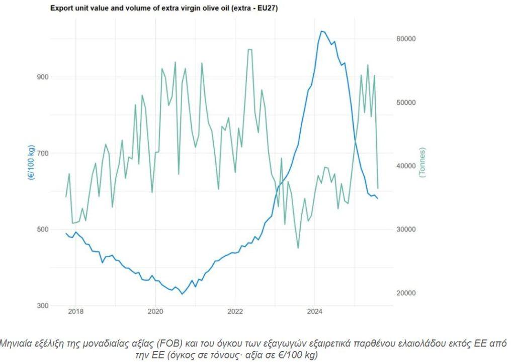 Τον Αύγουστο, η μέση μοναδιαία αξία των εξαγωγών εκτός ΕΕ ανήλθε σε 5,32 ευρώ/κιλό, αντιπροσωπεύοντας μείωση 42% σε σύγκριση με την ίδια περίοδο του προηγούμενου καλλιεργητικού έτους. Η κατάσταση αυτή συνέβαλε σε αύξηση 11% των εισαγωγών ελαιολάδου από τις κύριες αγορές μεταξύ Οκτωβρίου 2024 και Ιουλίου 2025 .
