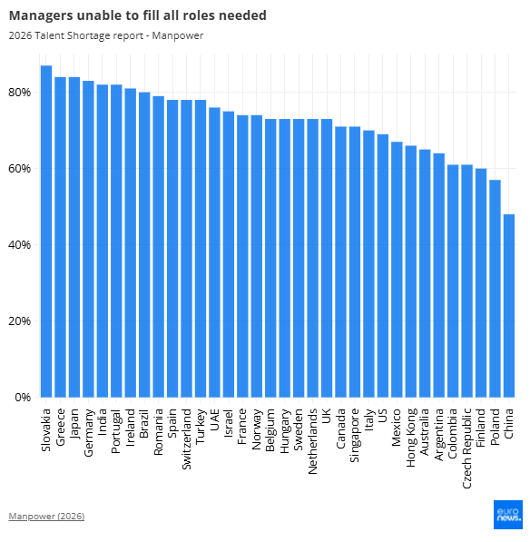 Στην κορυφή της λίστας βρίσκεται η Σλοβακία, όπου το 87% των εργοδοτών δηλώνει ότι δεν μπορεί να καλύψει όλες τις θέσεις εργασίας που χρειάζεται.