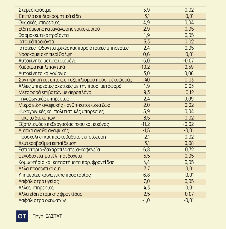 Στον αντίποδα, οι μεγαλύτερες μειώσεις εμφανίστηκαν στο ελαιόλαδο με 34,4%, το πετρέλαιο θέρμανσης με 12,9%, στον εξοπλισμό επεξεργασίας ήχου και εικόνας με 11,2%, στα καύσιμα και λιπαντικά με 10,2% και σε σάλτσες-καρυκεύματα με 6,3%.