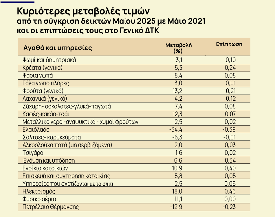 Η αύξηση του Γενικού ΔΤΚ κατά 2,5% τον μήνα Μάιο 2025, σε σύγκριση με τον αντίστοιχο Δείκτη του Μαΐου 2024, προήλθε κυρίως από τις μεταβολές στις ακόλουθες ομάδες αγαθών και υπηρεσιών:
