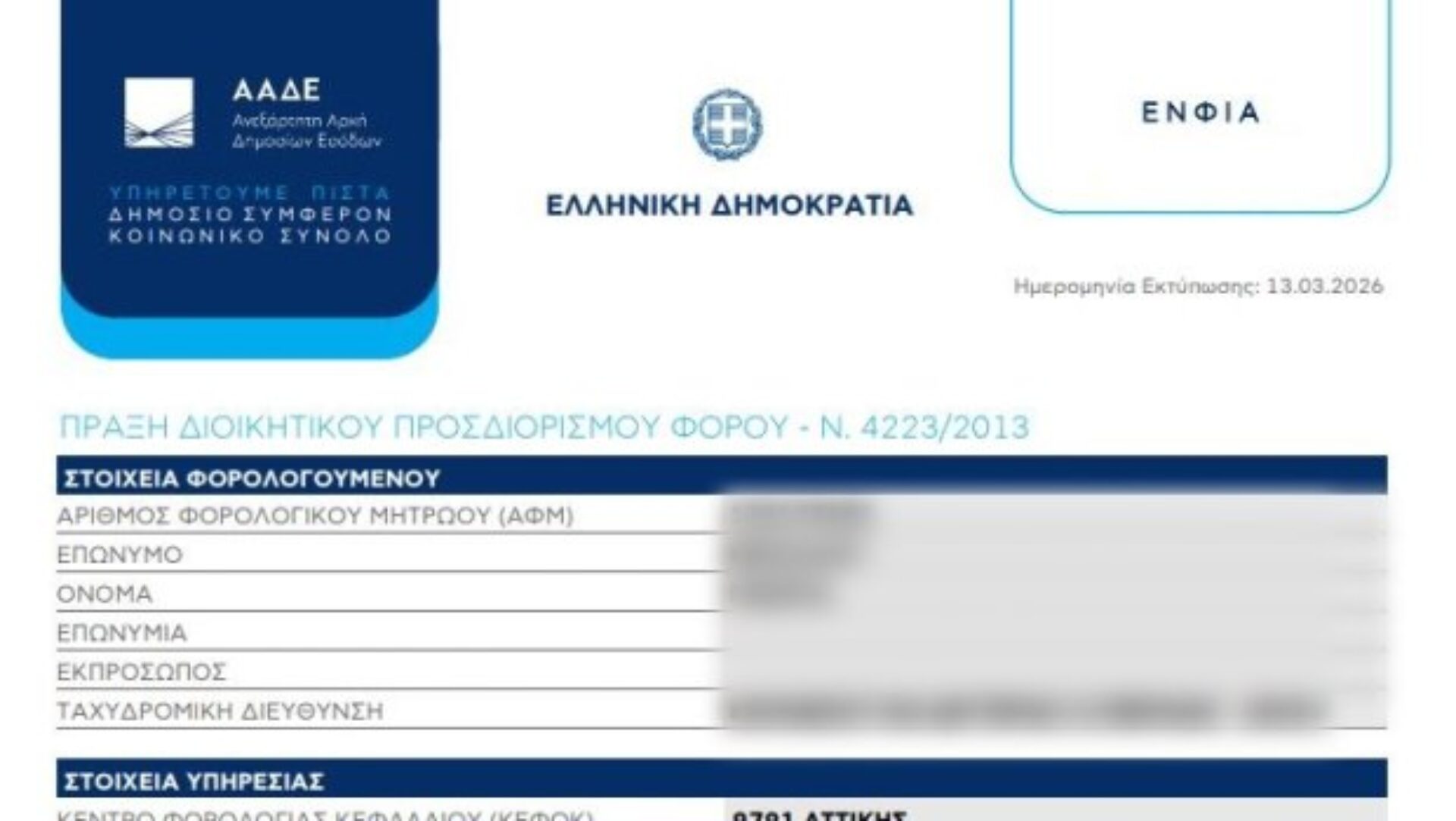 Από ώρα σε ώρα αναρτώνται τα εκκαθαριστικά ΕΝΦΙΑ 2026, με συνολικό λογαριασμό 2,3 δισεκατομμύρια ευρώ και πληρωμή σε 12 μηνιαίες δόσεις από τον Μάρτιο 2026 έως τον Φεβρουάριο 2027.