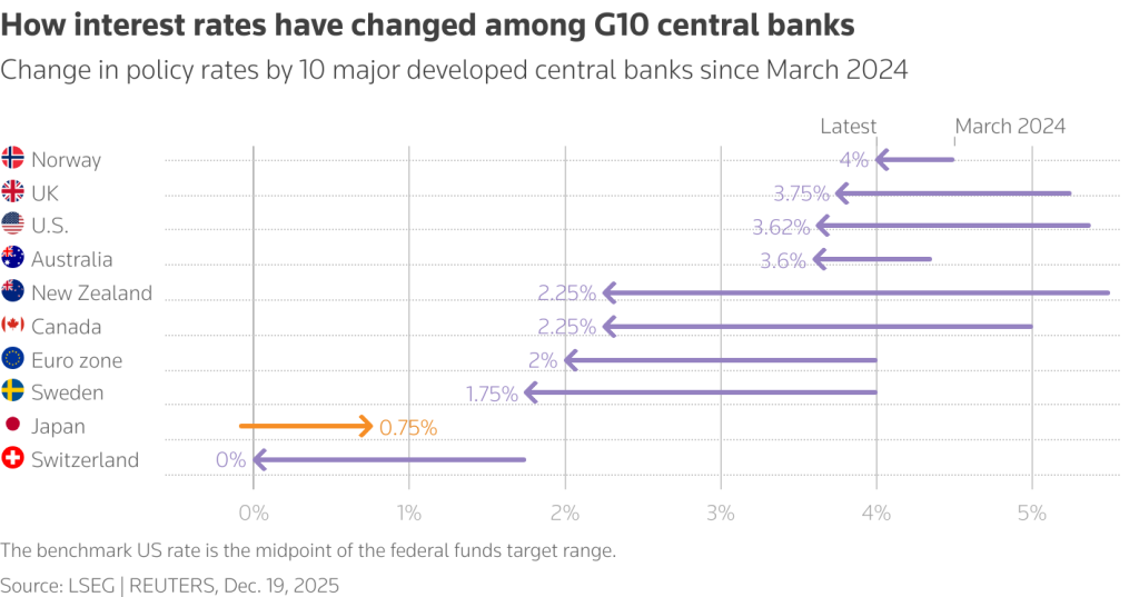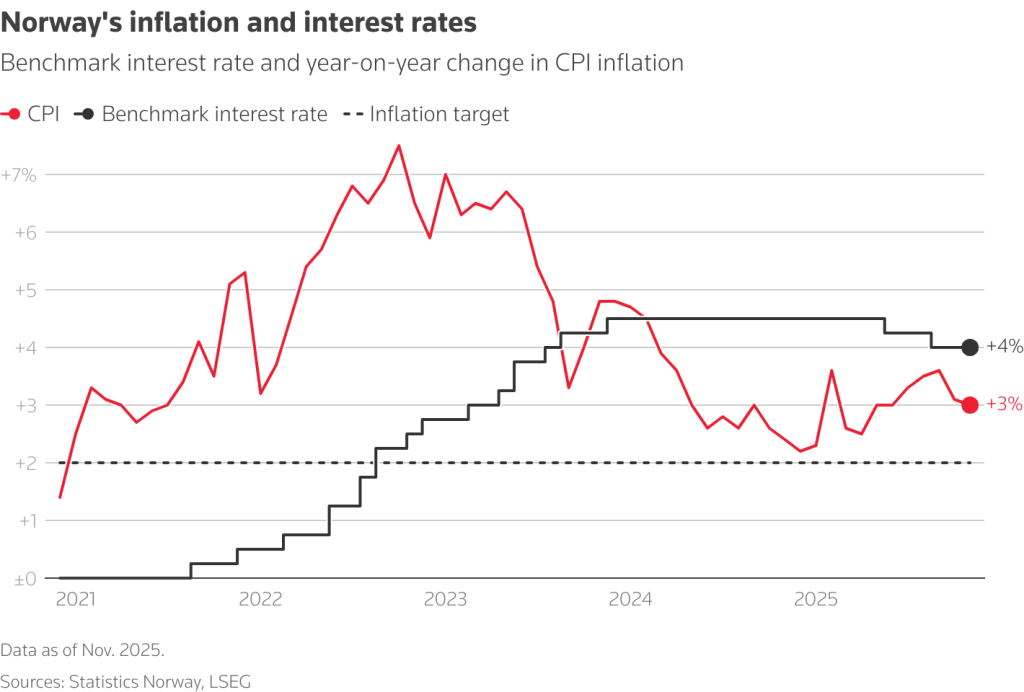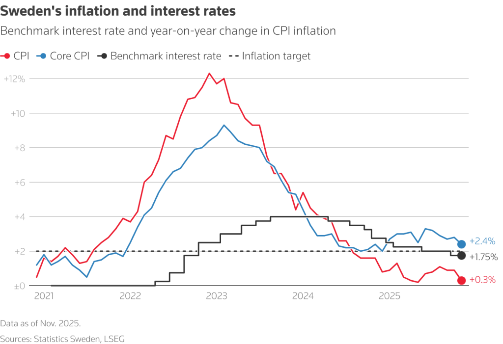 Η Riksbank της Σουηδίας αναμένει επίσης ότι η προηγούμενη νομισματική χαλάρωση θα αρχίσει να ωθεί την ανάπτυξη και, με τον ετήσιο πληθωρισμό να κυμαίνεται λίγο πάνω από τον στόχο του 2%, διατήρησε τα επιτόκια στο 1,75% στις 18 Δεκεμβρίου και οι αναλυτές προβλέπουν ότι θα τα αυξήσει ξανά στα τέλη του 2026.