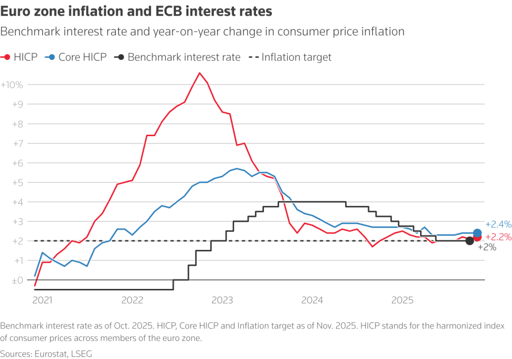 Η Ευρωπαϊκή Κεντρική Τράπεζα διατηρεί σταθερά τα επιτόκια στο 2% από τον Ιούνιο και η τελευταία της παύση την Πέμπτη συνοδεύτηκε επίσης από αναθεώρηση προς τα πάνω των προβλέψεων για την ανάπτυξη και τον πληθωρισμό.