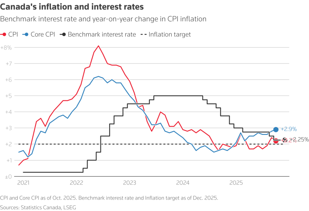 Η Τράπεζα του Καναδά αναμένεται να διατηρήσει τα επιτόκια αμετάβλητα έως το 2027, μετά την αύξηση της ανάπτυξης στο 2,6% το τρίτο τρίμηνο χάρη στις κυβερνητικές δαπάνες και τις ισχυρές εξαγωγές πετρελαίου, καθώς και την αγορά εργασίας.
